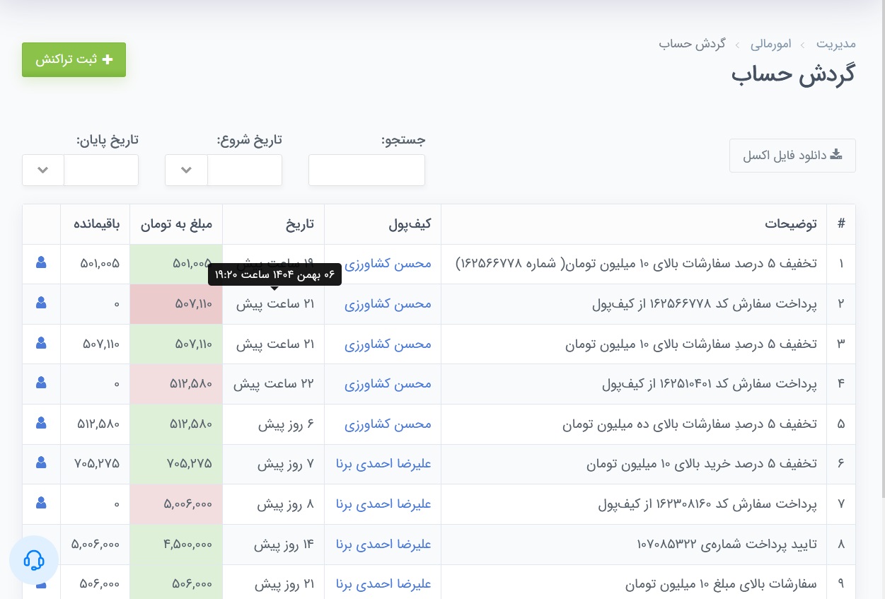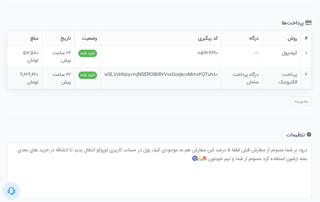 سفارشات با مبالغ بیشتر از 10 میلیون تومان شامل تخفیف 5 درصد😍 میشوند(کیف پول کاربر شارژ میشود). مشتریان و همکاران وفادار ما در این راستا نیز پیشرو بوده و از مزایایش بهره بردند که در تصویر زیر قابل مشاهده است.